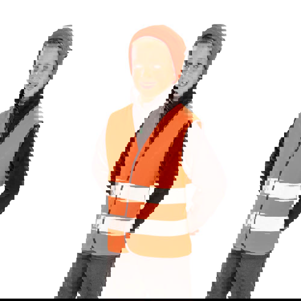 100% polyester. Ruime maatvoering. Afgewerkt met grijze polyester zomen. Genaaide reflecterende stroken (50mm). Voldoet aan EN1150 normering.