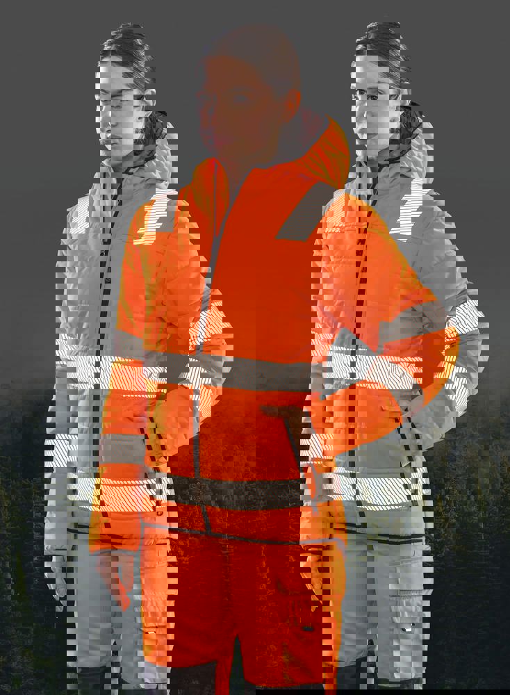 100% polyester. 100% gerecycled polyester. Gerecyclede gewatteerde ripstop veiligheidsjas. Bestand tegen schuren met REPREVE®. Vulling van gerecycled polyester 200 g/m² REPREVE®. Vezels gemaakt van gerecyclede petflessen. YKK-ritssluiting aan de voorkant met kinbescherming en schuiver. Tailleband, mouwuiteinden en capuchon met elastische bies. Langer achterpand. Gedrukte reflecterende stroken op het lichaam, de schouders en de mouwen. Zijzakken met rits. Gewatteerde capuchon. Binnenzak. Ophanglus. Norm High Viz: EN ISO 20471: 2013+A1: 2016 Klasse 2 (RIS-3279-TOM Klasse 2 (enkel oranje model)).