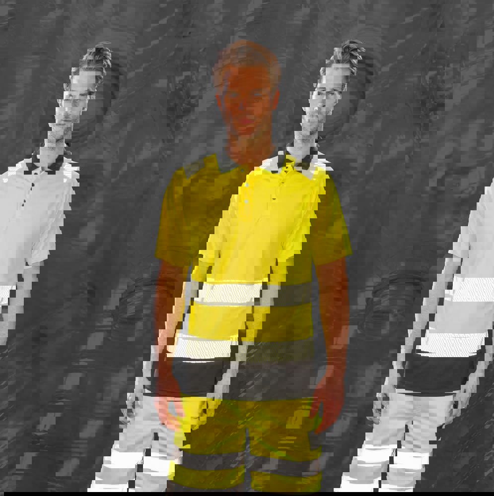 Lichaam: 100% gerecycled polyester. Kraag: 100% polyester. Duurzaam en superieur kwaliteitsgaren. Gemaakt van petflessen. Ademende en comfortabele veiligheidspolo in gerecycled tricot met stretchtechnologie. Sierstiksels aan de schouders en mouwboorden. Bedrukt met rekbare, reflecterende details. Donkere panelen in de taille en in de kraag. Knooplijst met 3 knopen en reserveknopen. Ribkraag met stretch. Norm High Viz: EN ISO 20471: 2013+A1: 2016 Klasse 2 (RIS-3279-TOM Klasse 2 (enkel oranje model)).