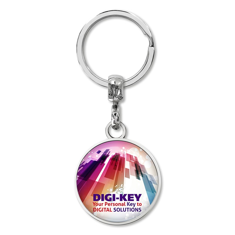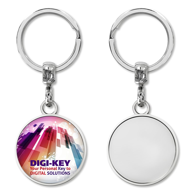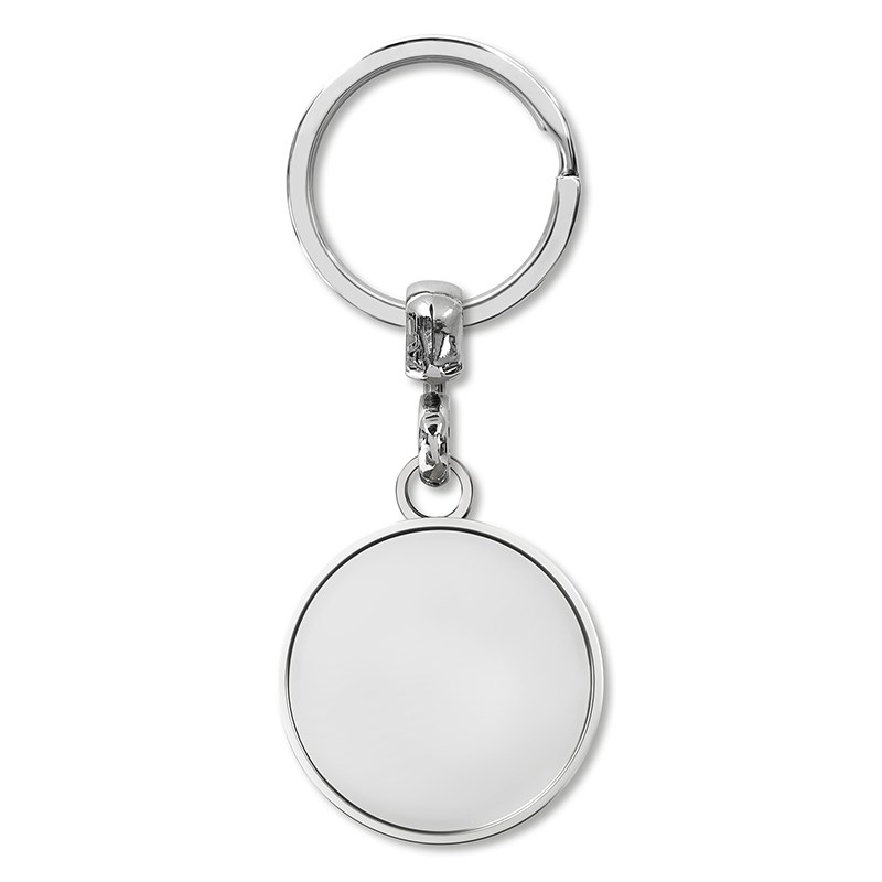 Subtiele ronde metalen sleutelhanger. Voor- en/of achterkant te voorzien van een kwaliteits dominglabel van Ø 32,3 mm.