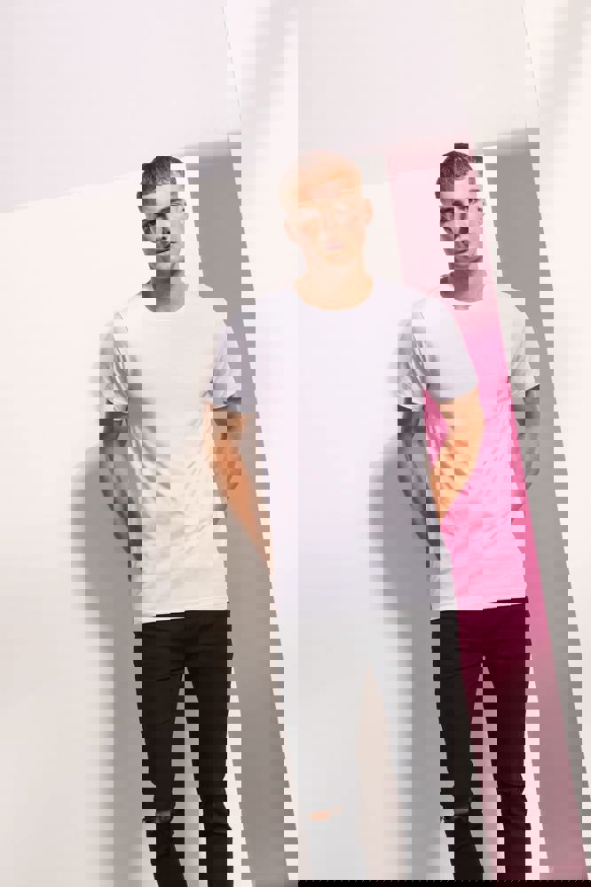 96% katoen / 4% elasthan. Enzym wash voor een zacht aanvoelen. Zijnaden. Moderne lange pasvorm. Ronde hals in rib met nektape.