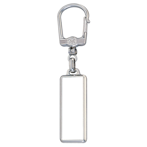 Metalen rechthoekige sleutelhanger, mat zilver. Met dubbelzijdige doming.