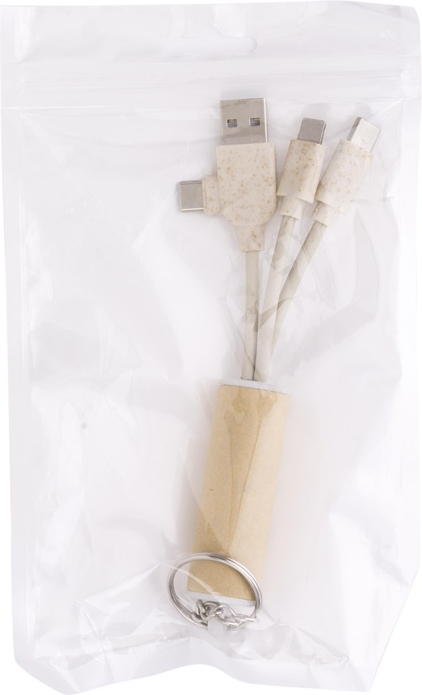 USB-oplader sleutelhanger met papieren details. Met USB-C, micro-USB en lightning. Individueel verpakt in een bruine kartonnen doos.