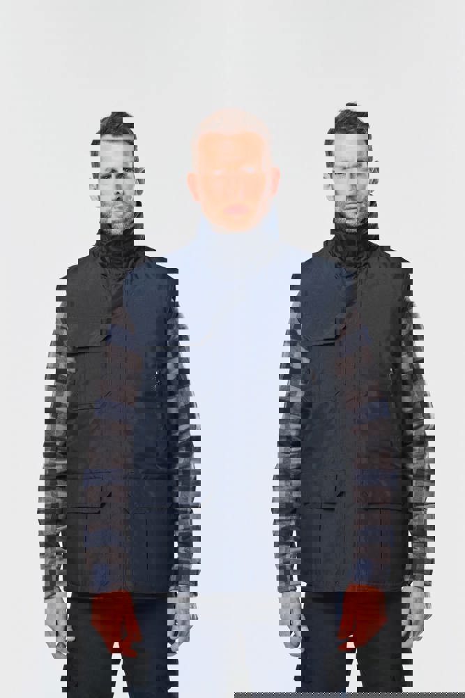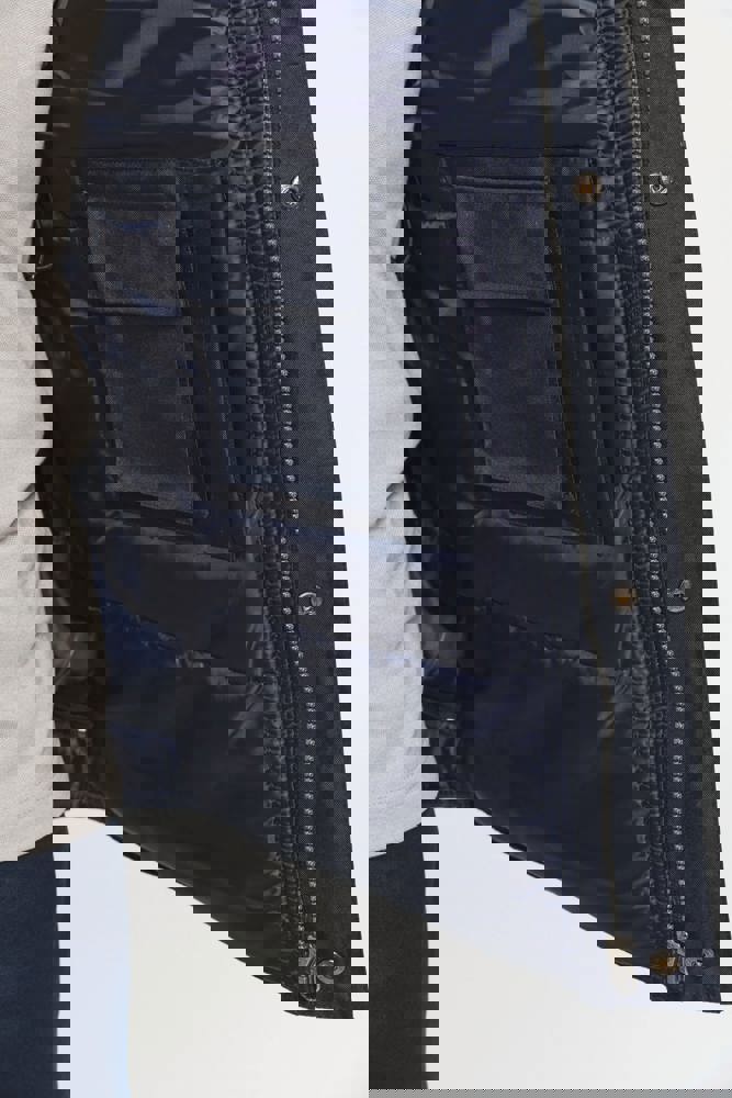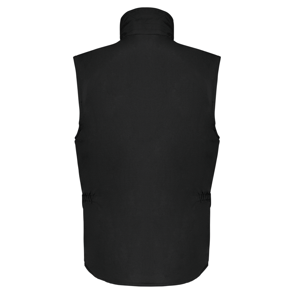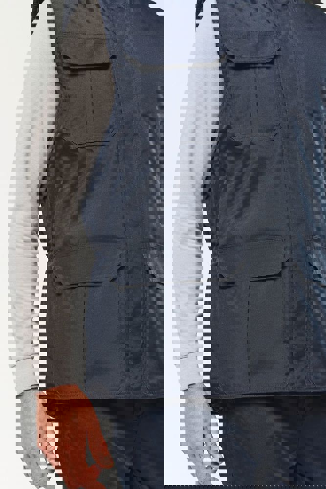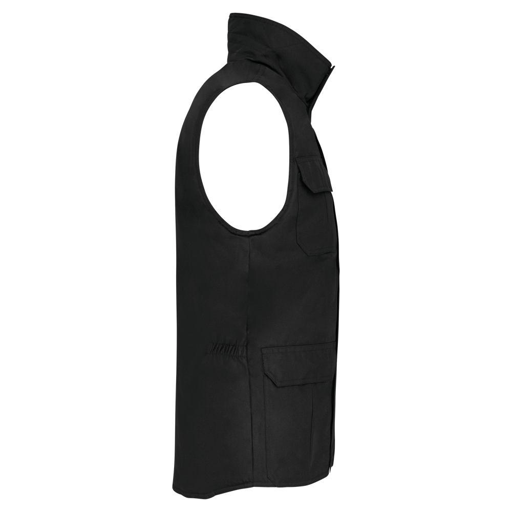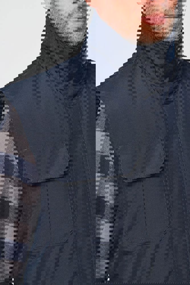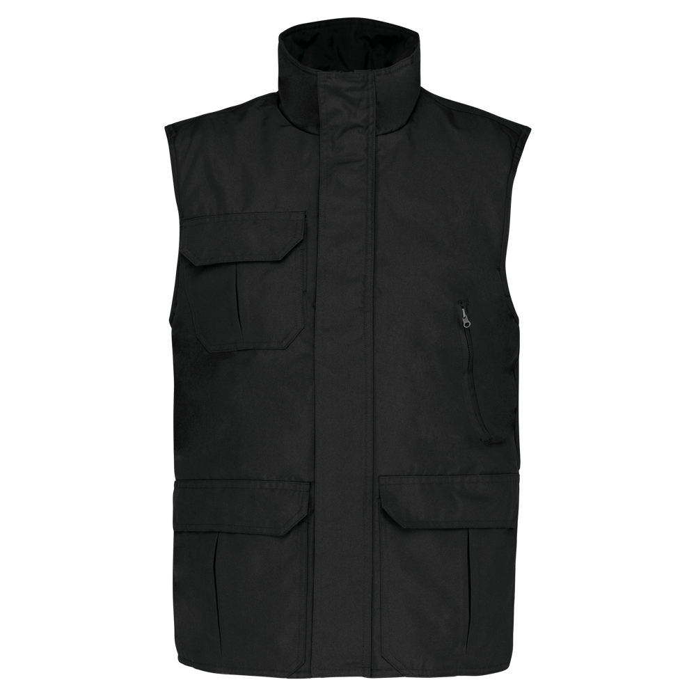 100 % polyester. Buitenkant: 100% oxford polyester met PVC inductie. Gewatteerde voering met 100% polyesterwatten. Ritssluiting verborgen onder een lijst met drukknopen. 4 buitenzakken (3 met overslag en 1 met rits). Elastische armsgaten en regelbaar met een stopper. 2 binnenzakken (1 met rits en 1 gsmzakje). Drukkersrits.