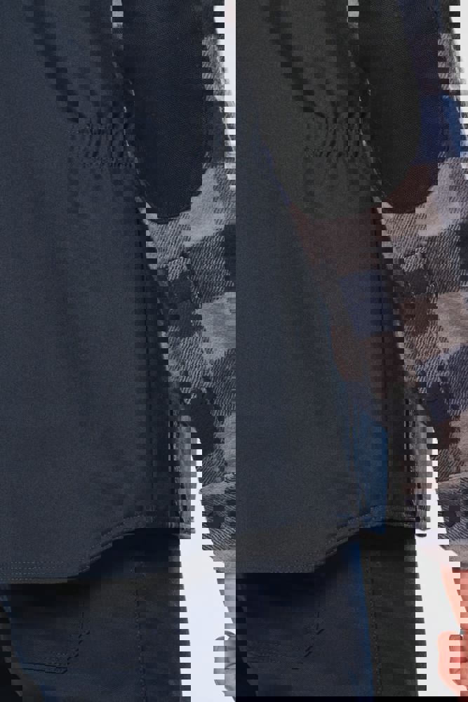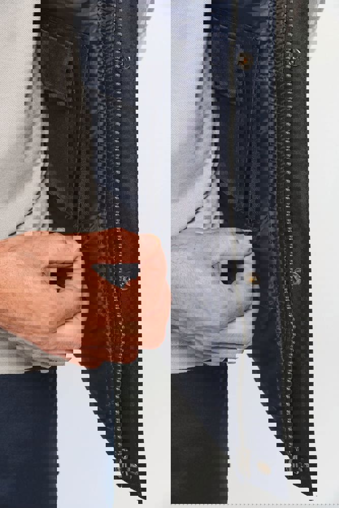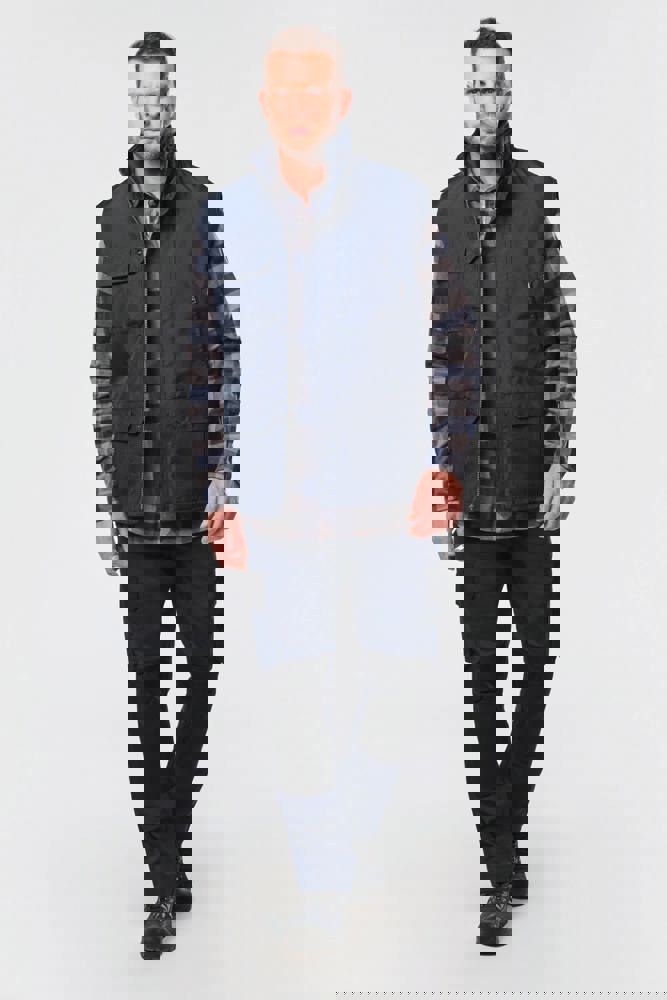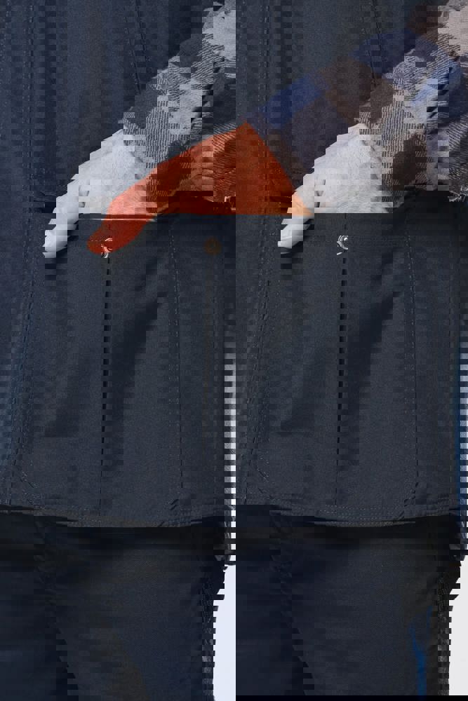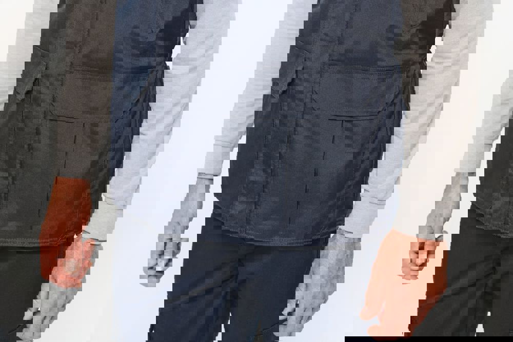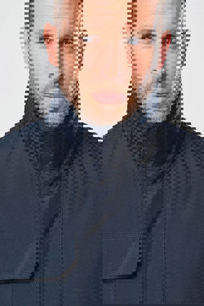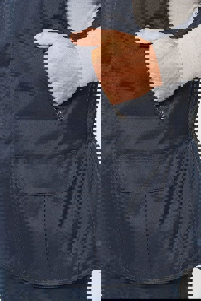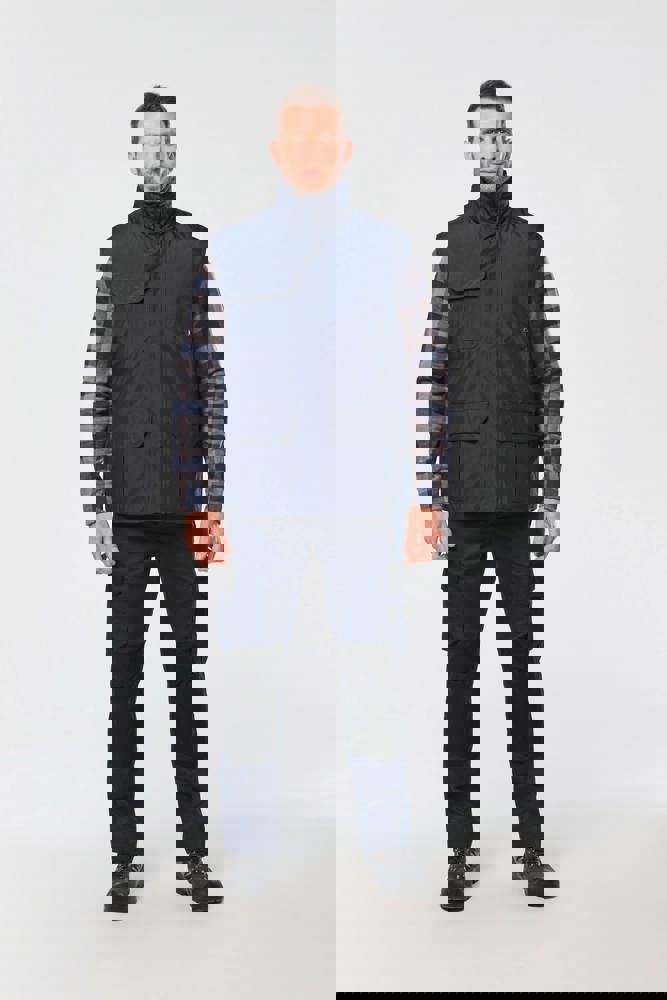 100 % polyester. Buitenkant: 100% oxford polyester met PVC inductie. Gewatteerde voering met 100% polyesterwatten. Ritssluiting verborgen onder een lijst met drukknopen. 4 buitenzakken (3 met overslag en 1 met rits). Elastische armsgaten en regelbaar met een stopper. 2 binnenzakken (1 met rits en 1 gsmzakje). Drukkersrits.