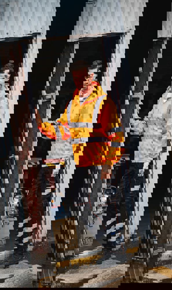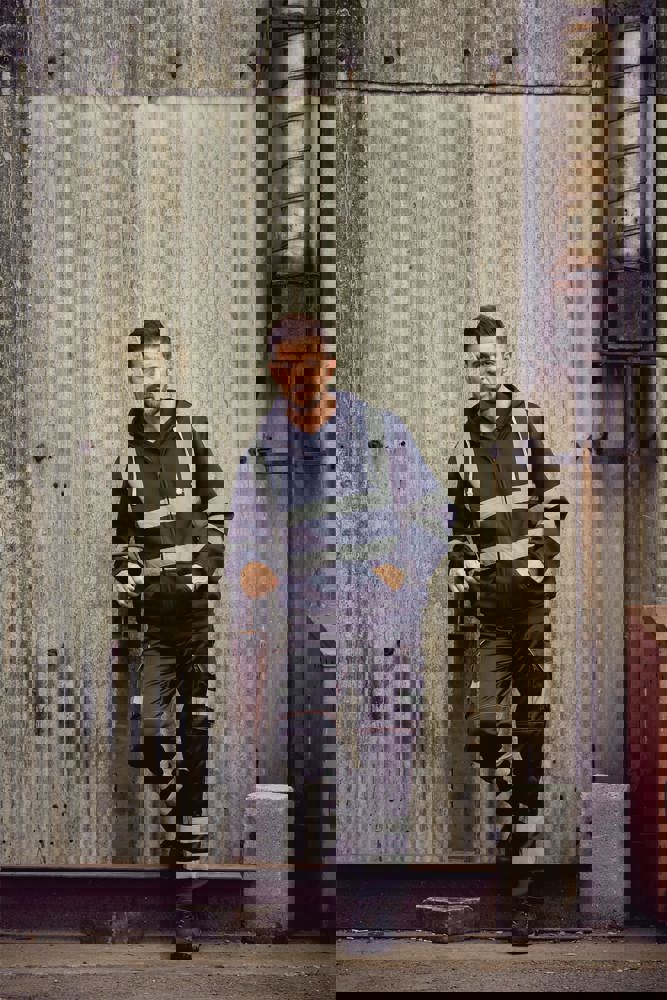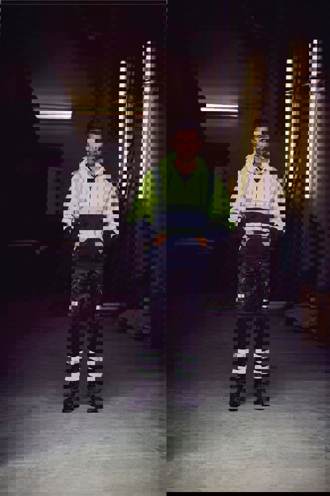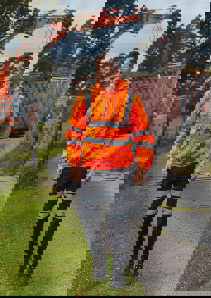 100% anti-pilling polyester. Twee 5 cm brede reflectiebanden rond het lichaam en armen, en één over elke schouder. Capuchon met trekkoord. Rits over de volledige lengte vooraan. Ribgebreide manchetten en tailleband. Afwerking met dubbele stiksels.Hi Vis Yellow enHi Vis Orange EN ISO20471 Class 3 conform.