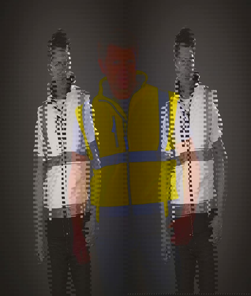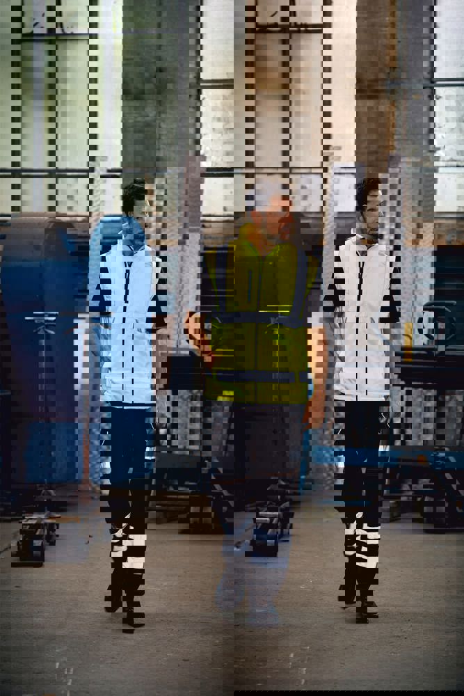 100% polyester. 3-laags, waterdicht tot 8.000mm. Buitenkant 100% polyester. middenlaag: TPU waterbestendig Binnenlaag: Microfleece. 100% waterdichte ritsen en ritstrekkers met merk aangebracht op de voor- en borstzak. 2 handwarmerzakken met ritssluiting. Verlengde rug. 5 cm brede reflectiebanden rond het lichaam en één over elke schouder. Voldoet aan EN ISO20471:2013 Klasse 2: enkel Hi Vis Yello, Hi Vis Yellow/Navy, Hi-vis Orange en Hi-vis Orange/Navy.