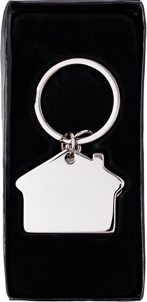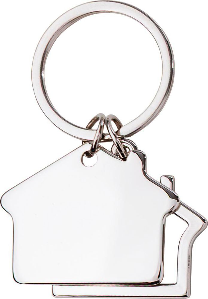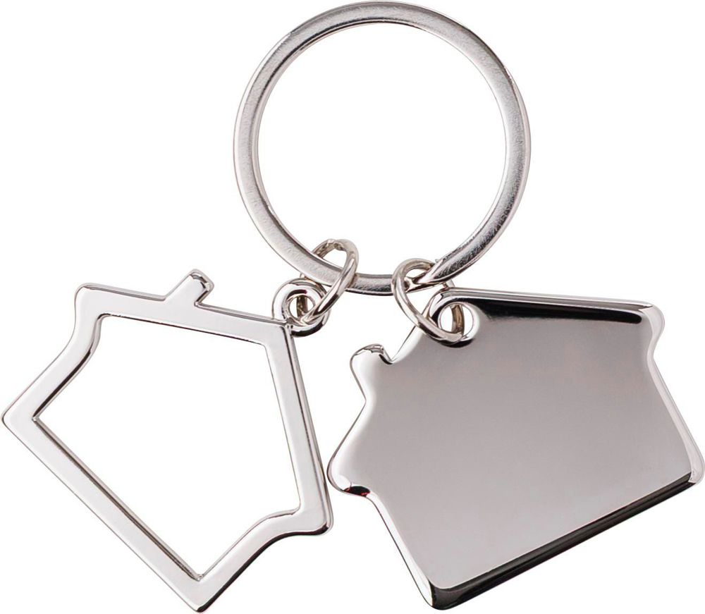 Tweedelige zink sleutelhanger, model 'huis', geleverd in een geschenkverpakking.